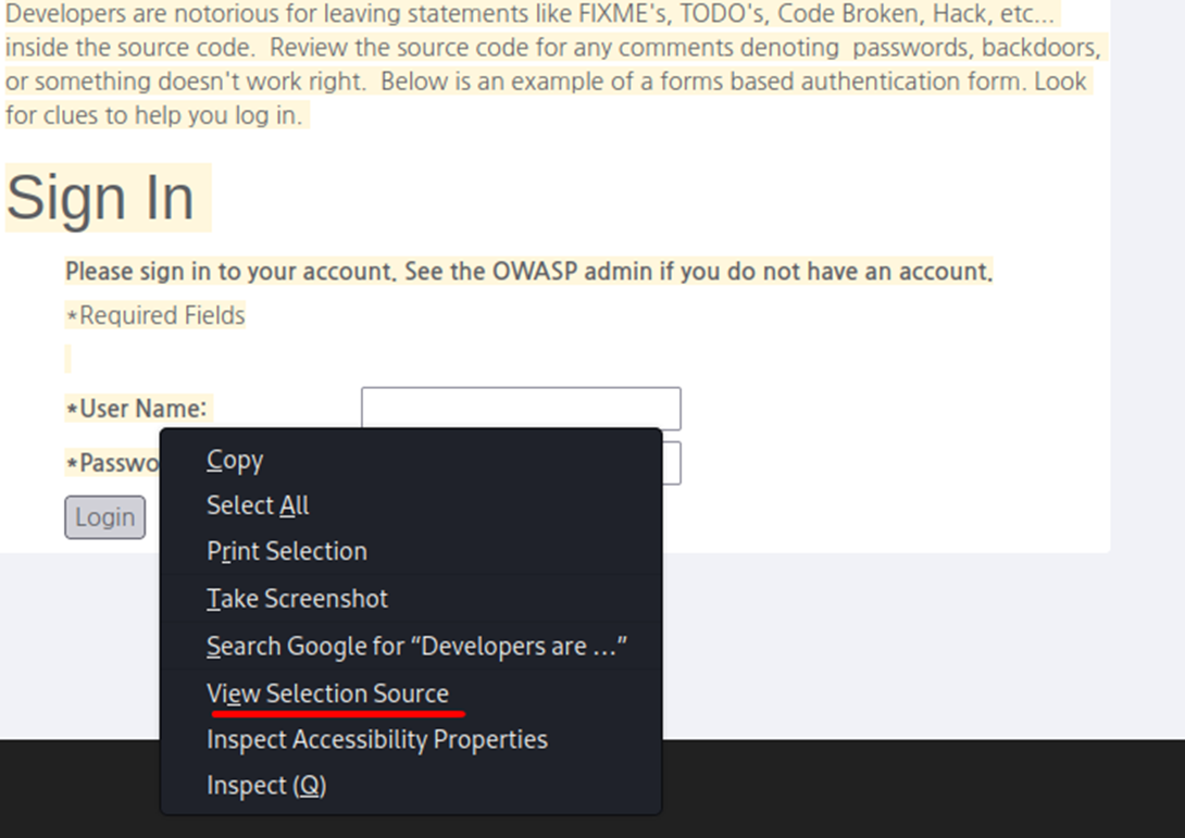 | admin에 비밀번호를 아무거나 입력하면 현재는 맞지않다고 나옴. HTML 태그에서 비밀번호를 찾아야함 ![]() 블록 설정을 하고 우클릭을하면 View Selection Source라는게 뜸 |