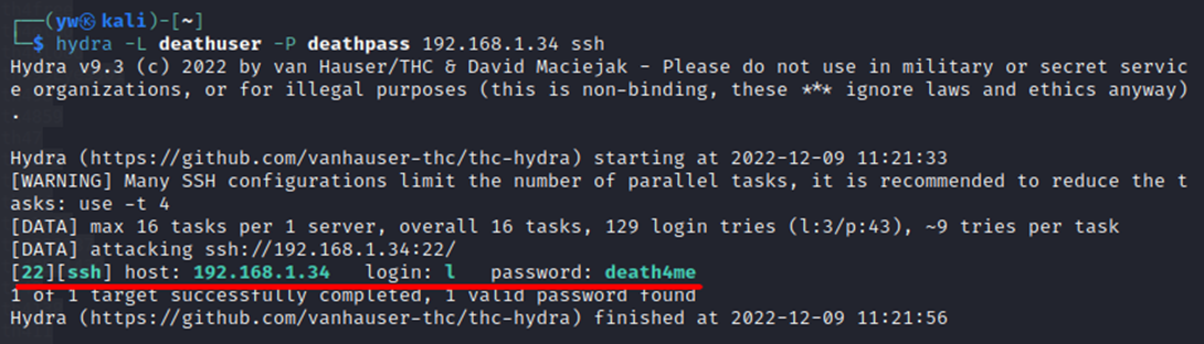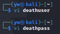vi deathuser / vi deathpass![]() deathuser에 입력할 내용(USERNAME) ![]() deathpass에는 아까 note.txt에서 확인한 사전대입용 비밀번호들을 입력하면 된다. |