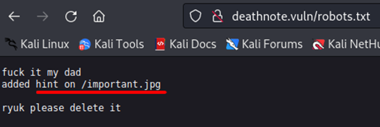 http://deathnote.vuln/robots.txt![]() important.jpg가 힌트라는 것을 알아냈다. |