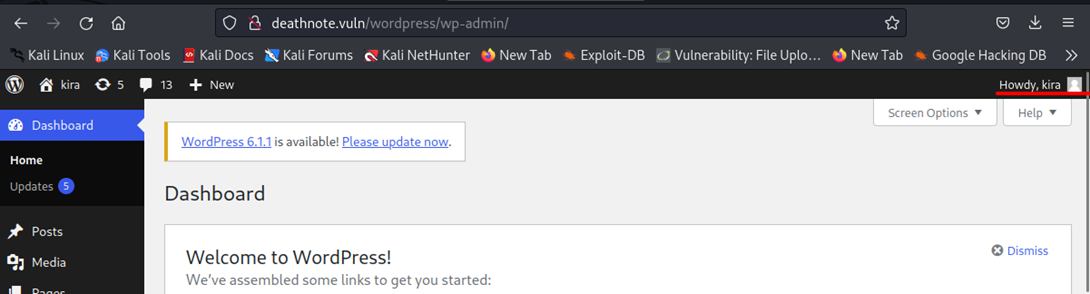 http://deathnote.vuln/wordpress/wp-admin![]() 아까 알아낸 유저이름 kira와 웹사이트 힌트에서 얻은 iamjustic3를 비밀번호로 로그인 |