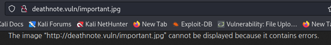 http://deathnote.vuln/important.jpg![]() 하지만 웹에서 열려고 하니 오류가 뜬다. 그래서 이미지 자체를 다운받아봤다. |