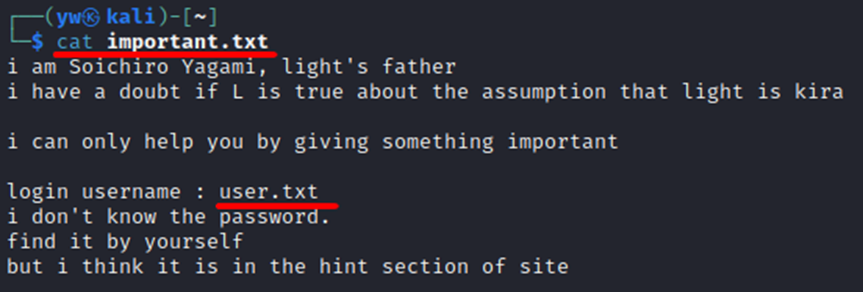 cat important.txt![]() user.txt 파일에 로그인 username이 있다는 힌트를 얻었다. |
