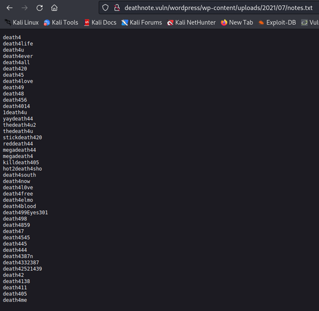 http://deathnote.vuln/wordpress/wp-content/uploads/2021/07/notes.txt![]() 경로를 복사해서 주소창에 넣어보면 이렇게 사전대입공격용 비밀번호 리스트들이 나온다. |
