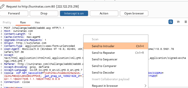 intercept가 켜진 상태에서 로그인 시도를 해봤다.