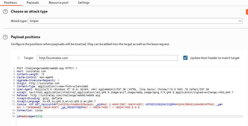 페이로드를 사용할텐데 페이로드는 비밀번호만 적용할 예정이라서 비밀번호를 §로 감싸준다.