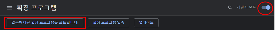 그런 다음 페이지 우측 상단에 개발자모드를 꼭 ON 시켜줘야 아래에 세가지 선택지를 볼 수 있다.