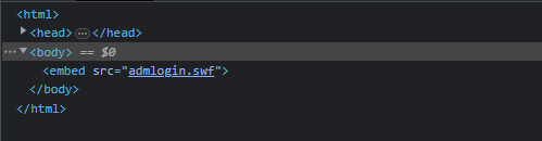 Adobe Flash Player가 2020년 12월 31일 부터 지원 종료가 됐었는데 그래서 플러그인이 지원되지 않는 메시지가 출력된다. 그래서 개발자도구를 확인해보니 admlogin.swf 파일이 임베디드 되어있는 것을 확인할 수 있었다. 일단 admlogin.swf 파일을 다운로드 받았다.