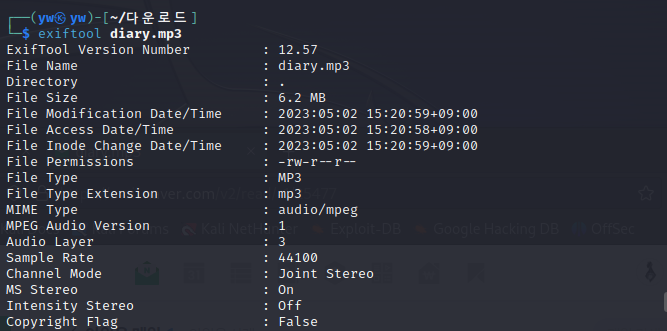 파일 안에 키값이 있다고 했으니 이번에도 아까 써니나타스 문제 13번과 같이 칼리가 켜져있는 김에 exiftool을 돌려봤다.