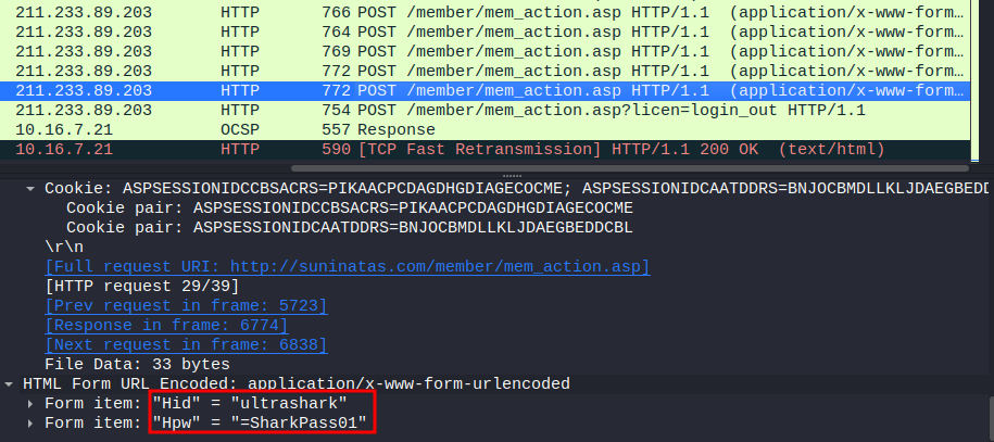 표시해 둔 것처럼 info를 클릭해 주면 info의 알파벳순 혹은 역순으로 재정렬을 할 수 있다. 재정렬 이후에 확인해 보니 POST 패킷에 /member/mem_action.asp 부분들을 확인할 수 있었다.