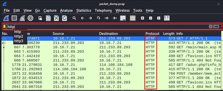 수많은 패킷을 일일이 확인할 수는 없기 때문에 suninatas.com의 멤버의 비밀번호를 알아내라는 문제에서 힌트를 얻어서 프로토콜이 http인 것들만 추려서 확인을 해봤다. http로 정렬하자마자 POST /member/mem_act(생략) 부분이 눈에 띄었다.