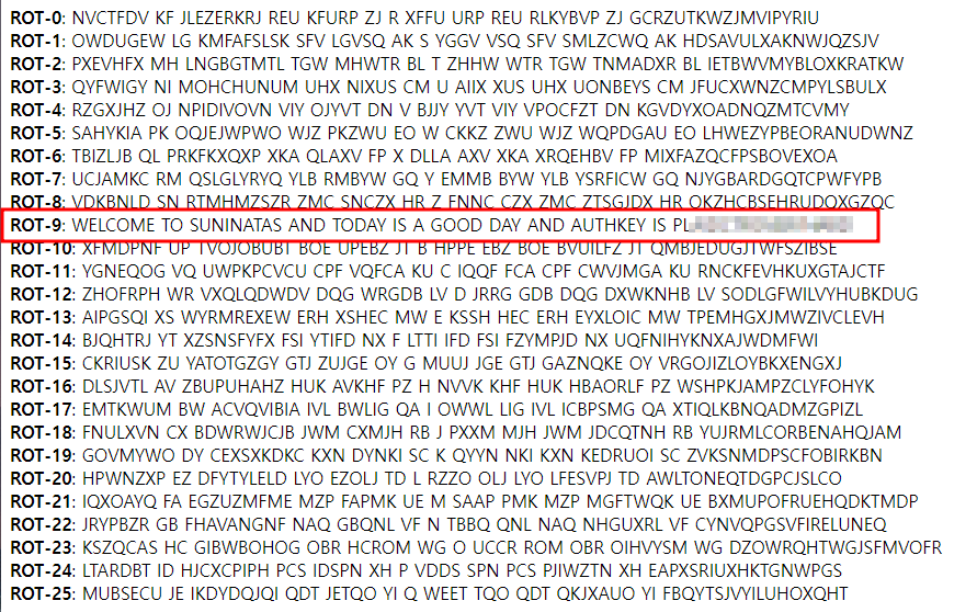 총 25가지의 평문이 나오는데 그중에 알아볼 수 있는 평문은 ROT-9였다.