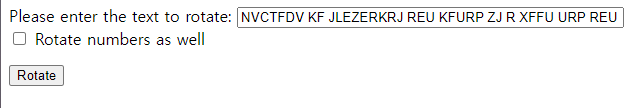 치환암호를 변환해 주는 사이트에서 아까 얻었던 문자열을 붙여 넣고 Rotate버튼을 눌렀다.