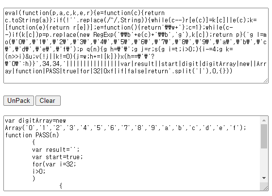 바로 난독화된 코드를 복호할 수 있는 사이트에 방문해서 언팩해봤다.
