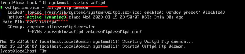 아까 했던 것 처럼 'systemctl status vsftpd' 명령어를 사용하여 ftp서비스 상태를 점검한다. 아까와는 다르게 'active (running)'이라는 문구가 연두색으로 출력되는 것을 볼 수 있다. 즉 실행이 잘 되고 있다는 뜻. 이제 방화벽 세팅을 해줄 차례다.