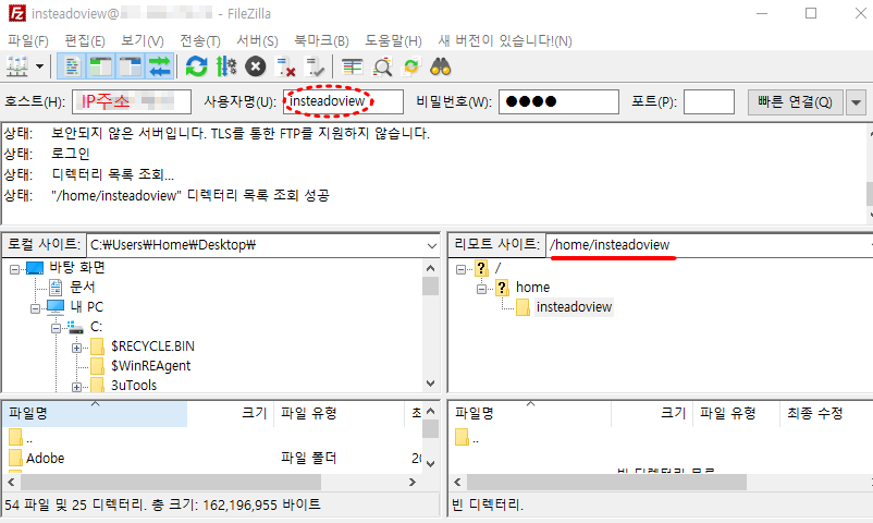 새로 만든 계정으로 파일질라와 연결할 때는 아까 root계정 연결에서 'sftp://IP주소'를 입력했던 것과는 다르게 그냥 'IP주소'만 입력하고 새로 만든 계정명, 비밀번호만 입력해주면 연결이 된다. 연결에 성공하면 앞서 말한 것과 같이 /home 디렉토리 밑에 새계정이름의 디렉토리와 연결된 것을 확인할 수 있다.