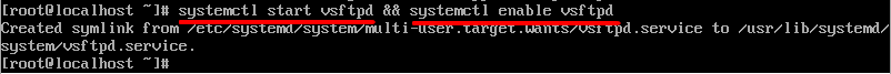 그래서 'systemctl start vsftpd(서비스 시작명령어)'와 'systemctl enable vsftpd(머신이 종료되더라도 재실행시 서비스를 유지시켜주는 명령어)'를 입력하여 ftp서비스를 실행시킨다. 두 가지 명령어를 한 번에 처리할 때는 위 그림처럼 명령어와 명령어 사이에 '&&'을 입력해주면 된다.