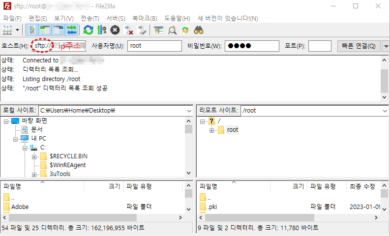 호스트란에 'sftp://머신IP주소'를 입력하면 root계정으로 연결이 잘 되는 것을 볼 수 있다. 이제 윈도우에 있는 파일들을 우리가 구축해둔 가상머신에 자유롭게 업로드, 다운로드를 할 수 있게 되었다.