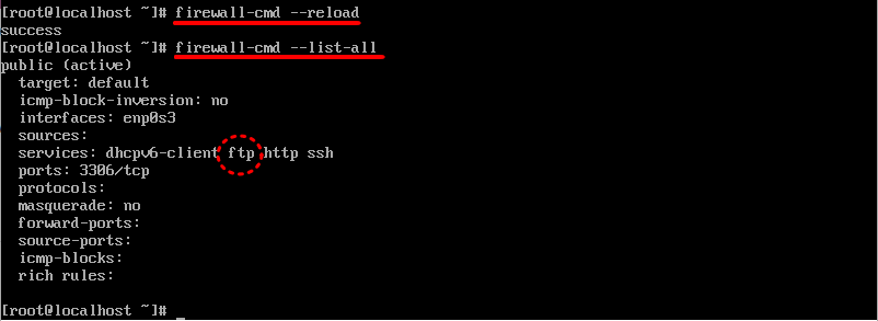 이제 적용을 시킬 차례다. 'firewall-cmd --reload' 명령어로 우리가 추가한 서비스에 대한 명령어를 적용시켜준 뒤에 'firewall-cmd --list-all' 명령어를 통해서 ftp 서비스가 활성화 됐는지 확인해주면 된다. 활성화가 됐다면 그림처럼 ftp라는 글자가 출력된 것을 확인할 수 있다.