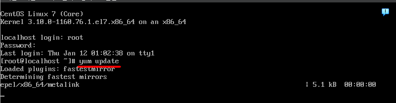머신이 구동완료 됐다면 머신 구축 시 설정해둔 계정과 pw를 입력하고, 위 그림과 같이 'yum update' 명령어를 최초 1회 실행시켜준다. 'yum update' 명령어는 패키지 업데이트 작업 명령어인데, 이번엔 패키지 명을 따로 지정하지 않았기 때문에 모든 패키지에 업데이트 작업이 실행된다.