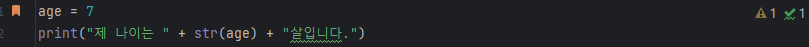 age는 7이라는 정수로 지정이 되어있기 때문에 str을 사용하여 문자열로 바꿔주면 출력이 된다.