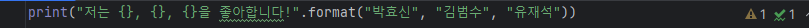 위 캡쳐처럼 먼저 포맷을 작성해주고, 그 뒤에 .format(값들)을 입력하면 된다.