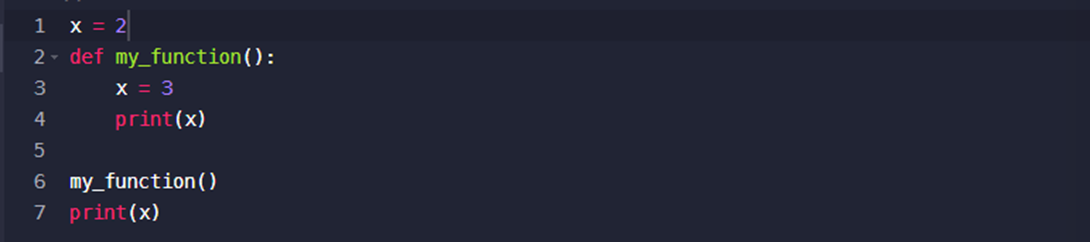 그 이유는 my_function 내에서 정의 했기 때문이다. 즉 my_function은 로컬변수(함수)인데 그 안에서만 정의된 것이다. 그래서 아래와 같이 로컬 함수 밖에서 글로벌 변수 → x = 2로 정의를 해준다.