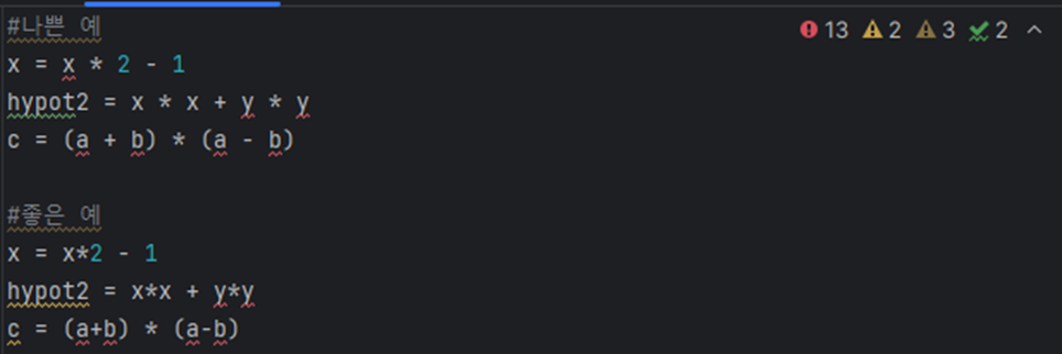 하지만 연산의 “우선 순위”를 강조하기 위해서는, 연산자 앞뒤로 띄어쓰기를 붙이는 것을 권장한다.