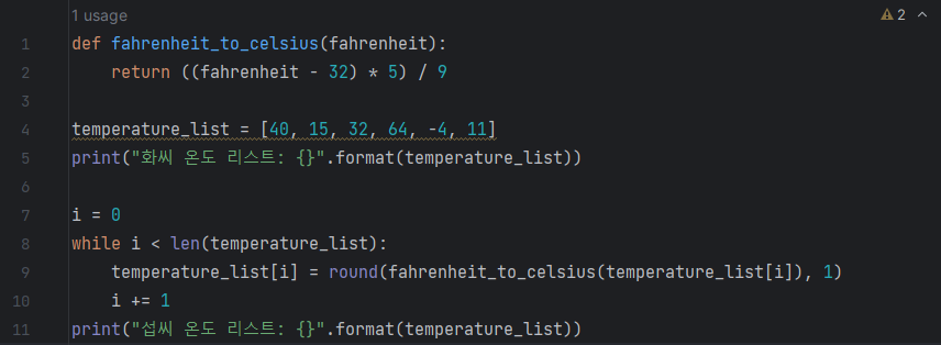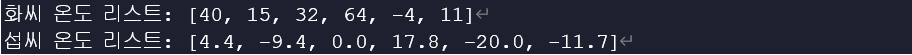 print("섭씨 온도 리스트: {}".format(temperature_list))
