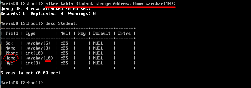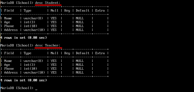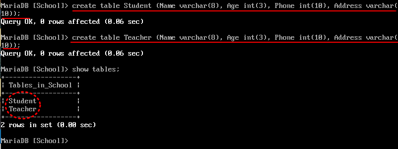 'create table Student (Name varchar(8), Age int(3), Phone int(10), Address varchar(10));'