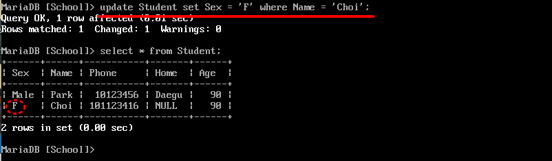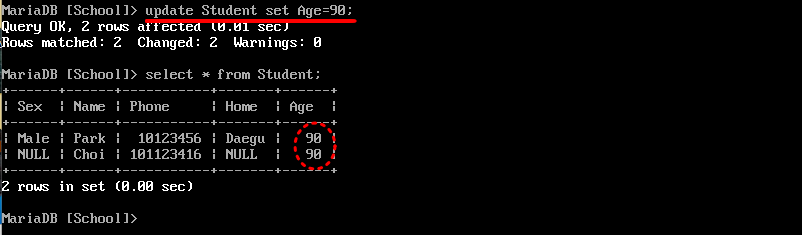 한번의 명령어로 한 필드의 모든 데이터를 바꾸고 싶을 때 사용한다. 캡쳐를 보면 나이 필드가 모두 90으로 변경된 것을 볼 수 있다.