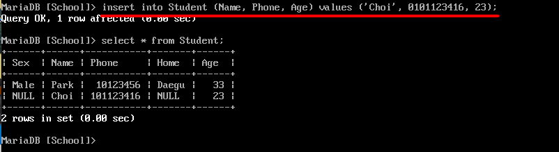 insert into Student (Name, Phone, Age) values ('Choi', 0101123416, 23);