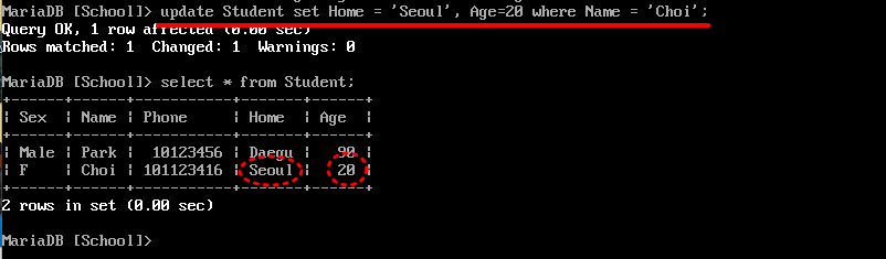 update Student set Home = 'Seoul', Age=20 where Name = 'Choi';