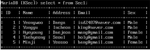 - KSec(DB) : Sec1 테이블을 생성하고 임의의 데이터 5개 행 입력