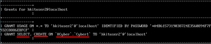 - hkituser2: KCyber DB의 Cyber1 Table에 대해 select, create 권한(로컬호스트)