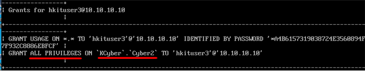 - hkituser3: KCyber DB의 Cyber2 Table에 대해 모든 권한(원격호스트: 10.10.10.10)