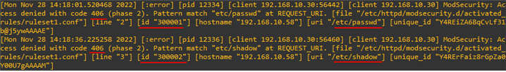 Kali → Wordpress로의 웹해킹 공격에 대해 WAR(mode_security)의 Rule 설정을 완료하고 공격에 대한 로그를 탐지하고 확인하시오.